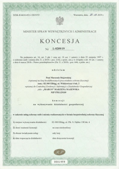 Firma MARGO, specjalizująca się w ochronie fizycznej osób i mienia, powstała w grudniu 2018 roku. Działamy na podstawie koncesji MSWiA o numerze L-209/19.